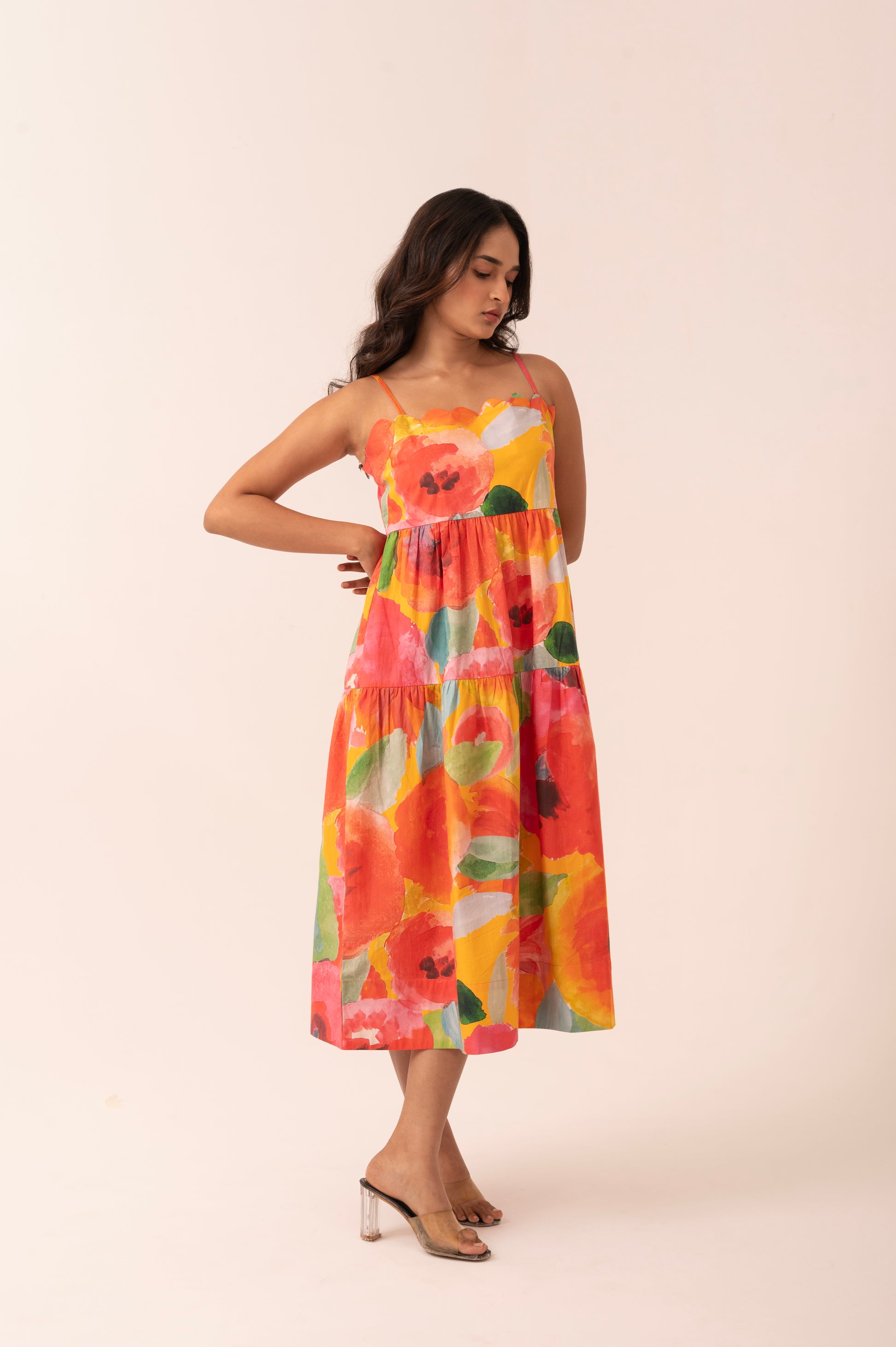 The Floretta Scallop Dress brings vibrant charm with its bold watercolor print and delicate scalloped neckline.