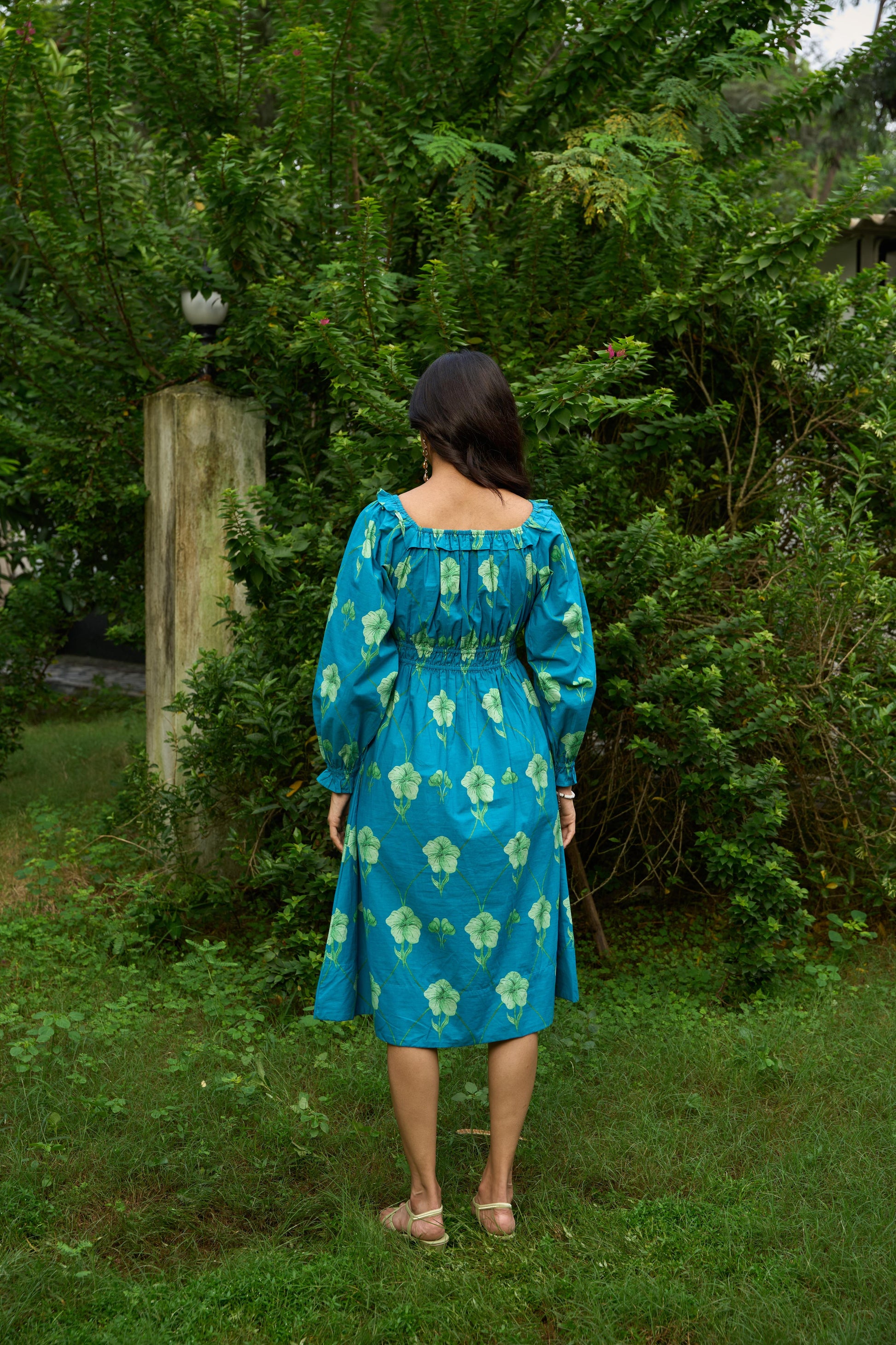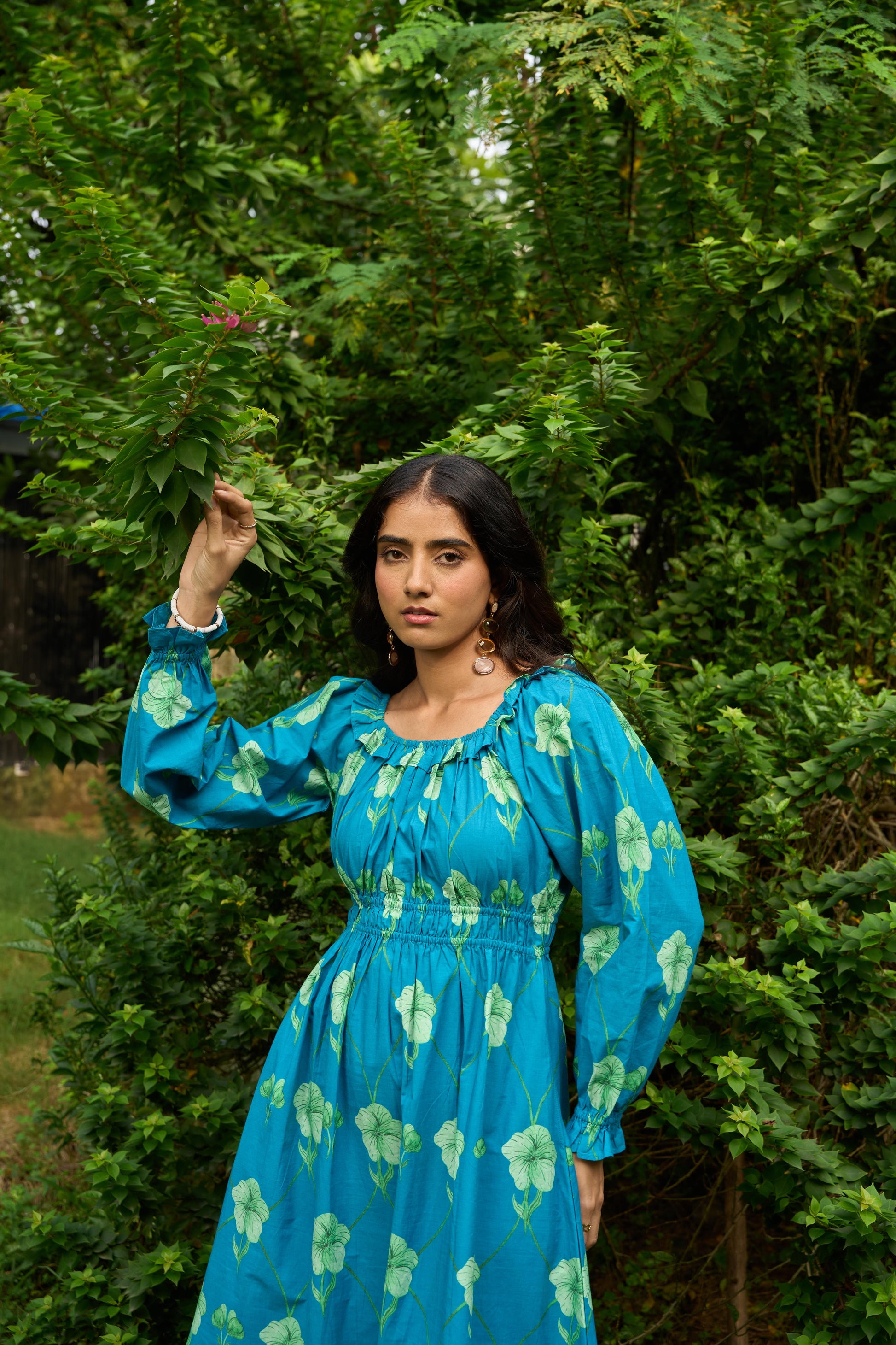 A sea bloom-inspired midi in ocean tones with contrast floral prints, perfect for laid-back elegance.