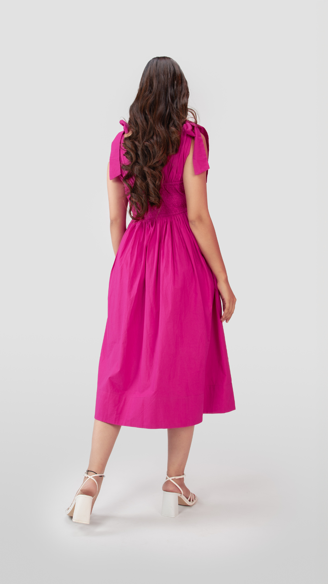 A striking fuchsia midi dress that brings together structured details and playful charm. With its pleated bodice and bow-tied shoulders, this dress is made for statement-making moments while keeping comfort at its core.