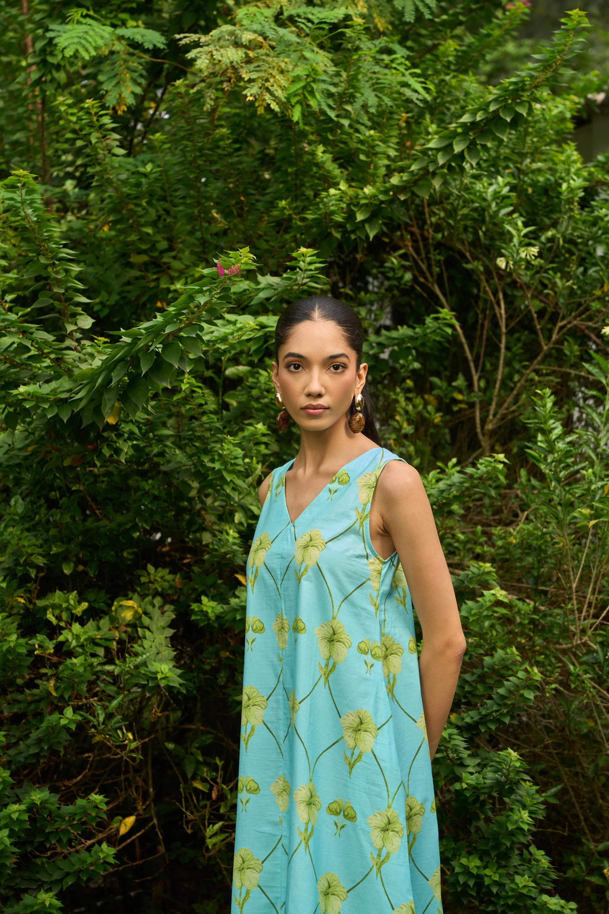 A sleeveless midi with refreshing marine-inspired prints for sunlit days.
